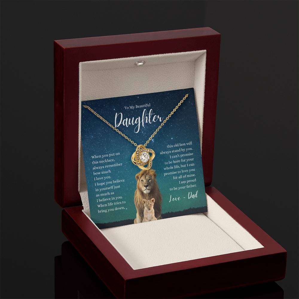 To My Beautiful Daughter; When you put on this necklace, always remember how much I love you. I hope you believe in yourself just as much as I believe in you. When life tries to bring you down, this old lion will always stand by you. I can't promise to be here for your whole life, but I can promise to love you for all of mine. I am proud to be your father. Love, Dad