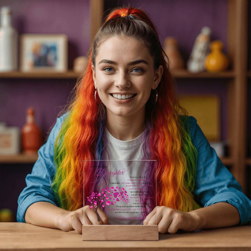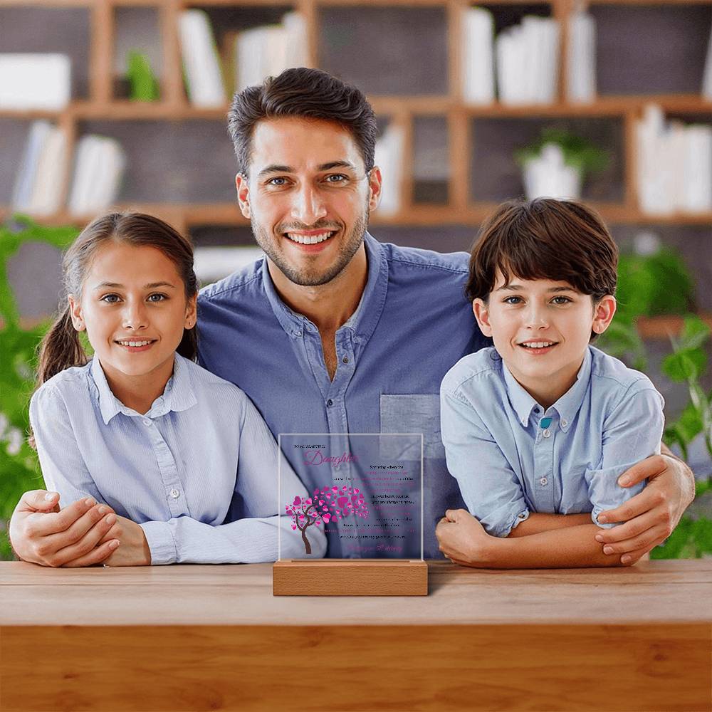 With its compact size and sturdy construction, the Daughter Keepsake Acrylic Plaque is suitable for display in various settings. Whether it's placed on a desk, shelf, or mounted on a wall, it serves as a captivating focal point, radiating warmth and love.